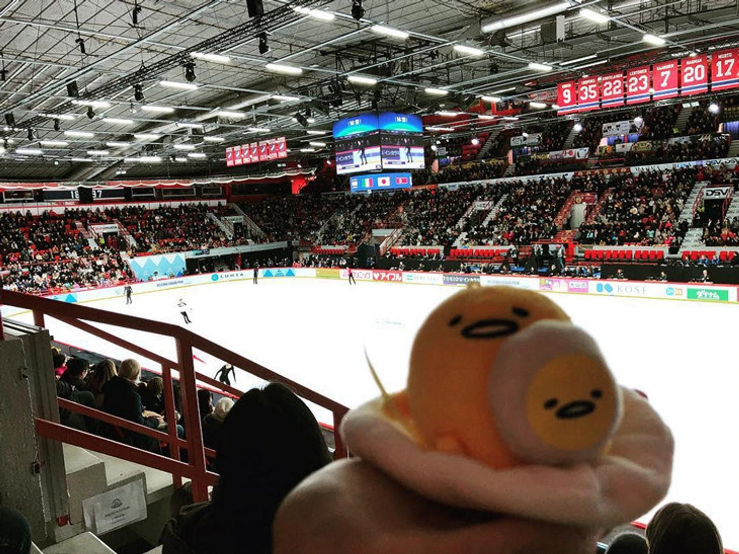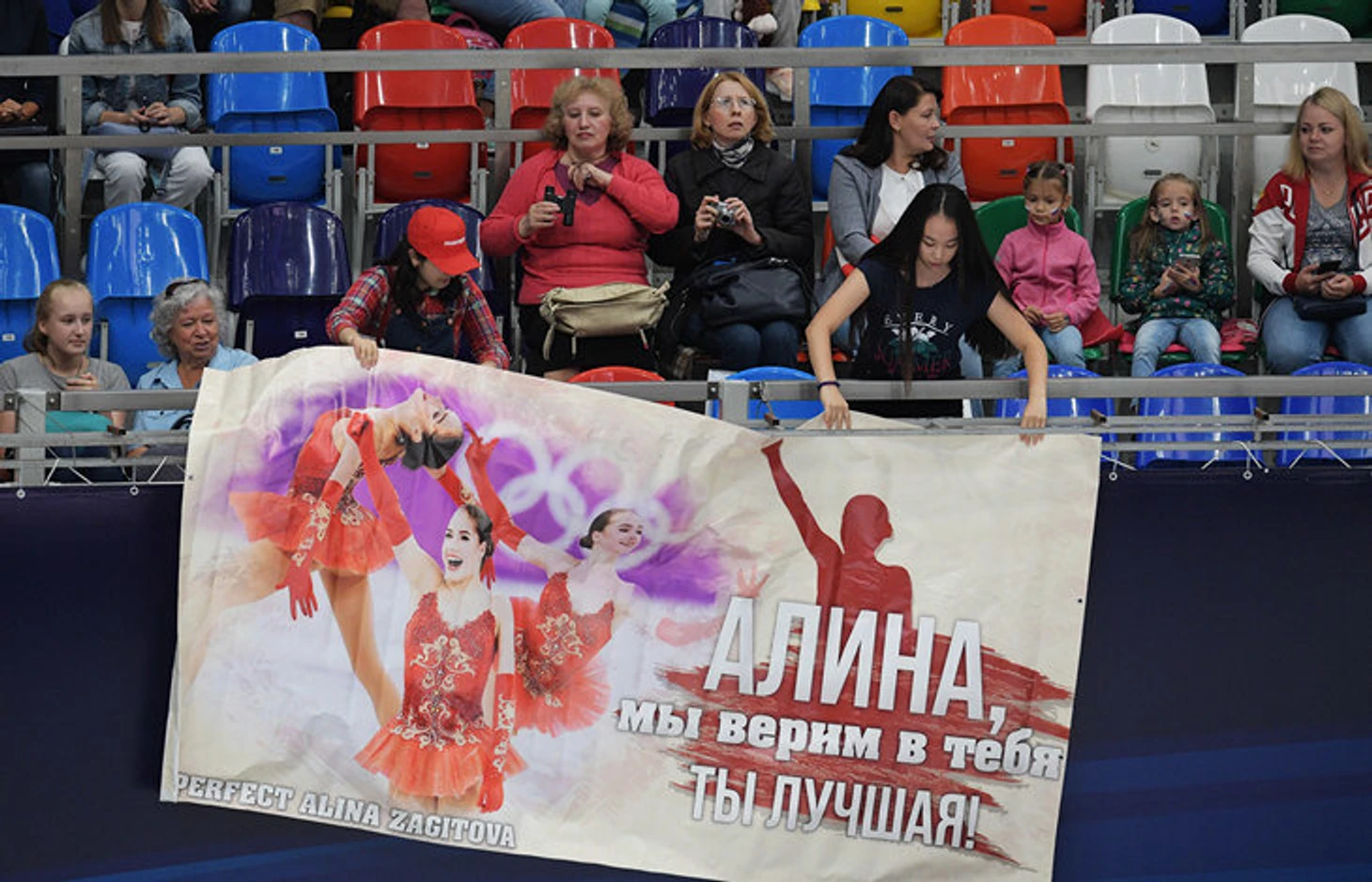 • флажки, шарфы, баннеры с именами фигуристов – на трибунах все больше болельщиков с опознавательными знаками. Иногда их раздают прямо при входе – бесплатно;