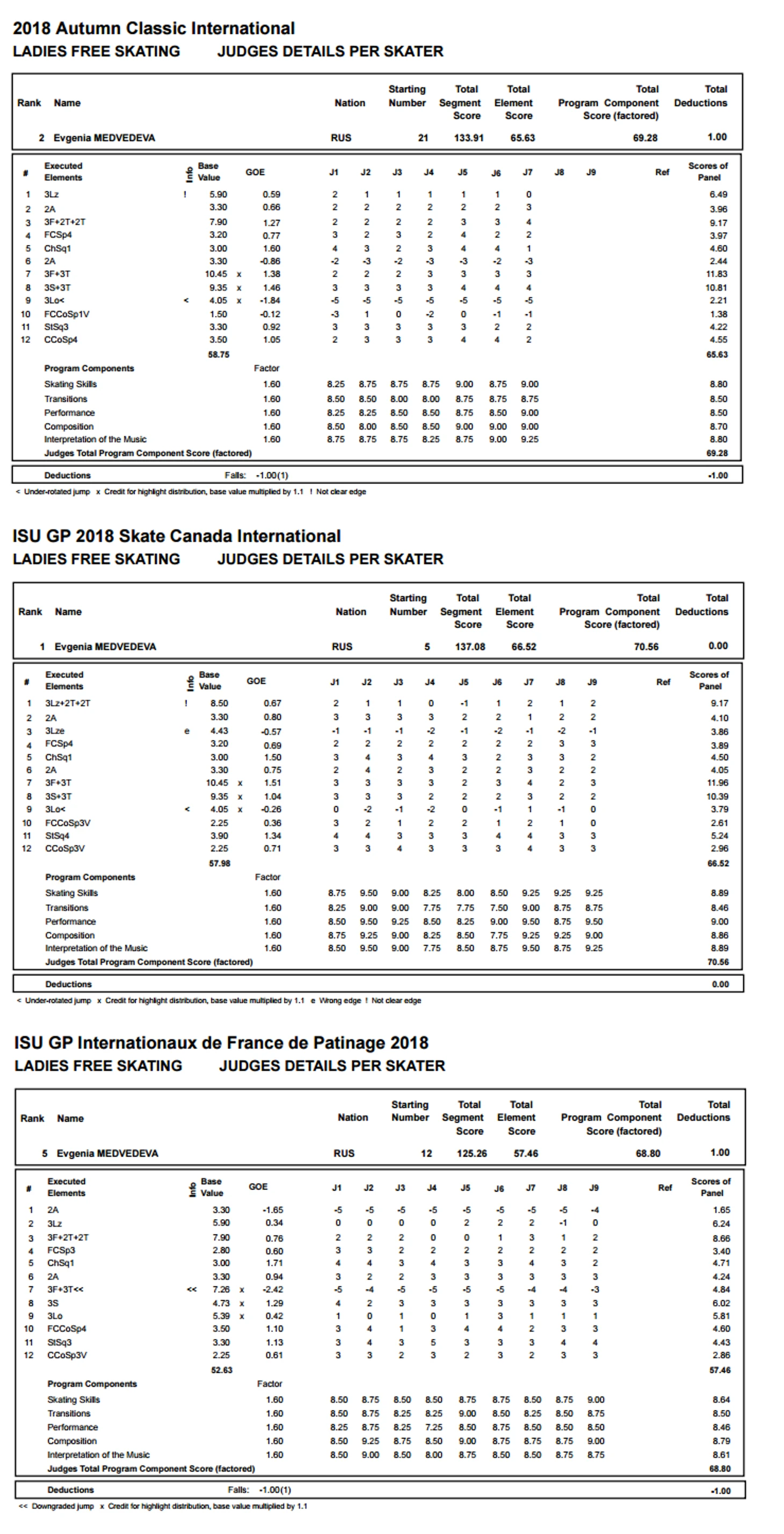 В сезоне 17/18 впервые за много лет она попробовала изменить свой привычный контент на более усложненный, но после 2х выступлений пришлось убрать эту затею, т.к. приходилось "подключать сознание" для исполнения. В результате чего прыжки уже не получались как раньше. Плюс злополучное ребро на лутце при переносе во вторую половину уже никак не удавалось замаскировать под псевдоплоское. И впервые за много лет техконтролер влепил значок "е", что по сути нивелировало все усложнения, ради которых все и затевалось. Как только все эти усложнения убрали все вернулось на прежнее место и уже на ЧЕ и ОИ все было плюс минус достойно. С учетом пропуска тренировок так вообще отлично.
