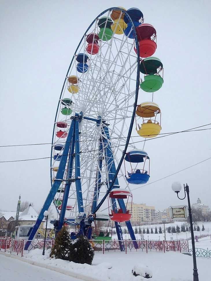 Парк культуры с милым ретро-колесом обозрения закрывается в 21:00 и открывается в 09:00 утром, а рядом с ним заливается почти стихийный открытый каток для всех желающих, правда, переобуваться придется в ближайшем сугробе.