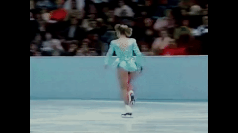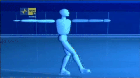 Вот она повернулась на 90° от начального положения, по идее сейчас должен закончиться преротейшн. Но что мы видим? Ко льду прикасается всё ребро конька маховой ноги, а не только зубец. А ноги пока и не думают отрываться ото льда.