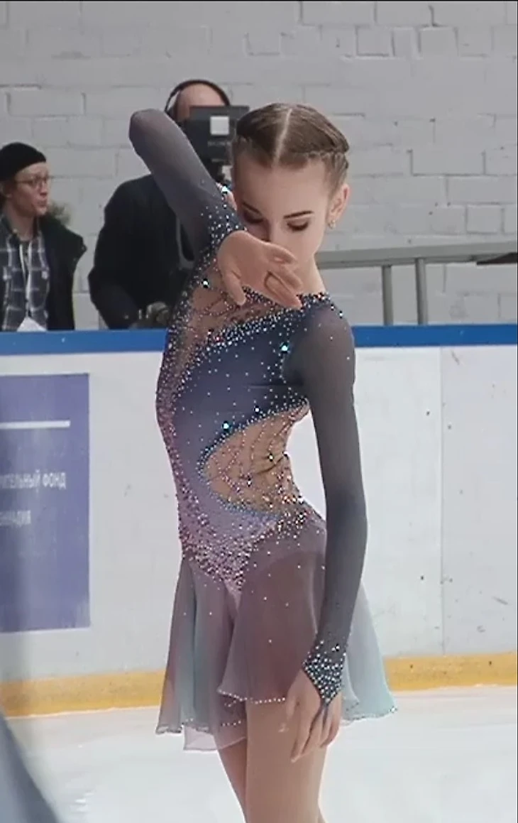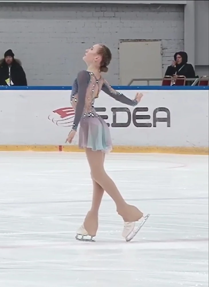 Когда на раскатку вышла третья группа, я, не вглядываясь в лица, вычислила Дашу Усачеву. По платью. Фирменный стиль Ольги Рябенко – пастельный градиент, струящаяся юбка. Но невероятной красоты! Лично для меня – в топ3 платьев нынешнего сезона. Сама Даша тоже очень понравилась, несмотря на откровенную неудачу: с одного прыжка неудачно выехала, со второго и вовсе упала, как итог – без каскада. Но каталась до конца, не сникла после падения и потому оставила хорошее впечатление.