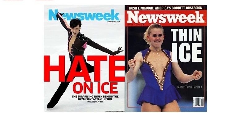 Джонни Вейр иллюстрирует тему номера о травле ЛГБТ-спортсменов в “Newsweek”, в котором время от времени появляются и другие фигуристы, например, вновь всем известная, слегка двинутая Тоня Хардинг, в откровенном даже по нынешним меркам наряде.