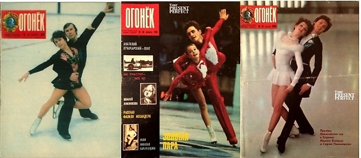 Для меня больший интерес представляют обложки с нашими современниками, теми, кто катается сейчас, либо совсем недавно завершил карьеру, но просто для сравнения начнём с винтажа – знаменитого художественного общественно-политическое журнала “Огонёк”, тираж которого исчислялся миллионами. В советское время фигурное катание было на пике популярности, и неудивительно, что фигуристы частенько оказывалась героями как первой полосы, так и внутренних вкладок.