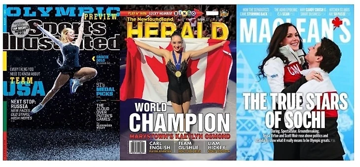 Красивый кадр с Грейси накануне ОИ в Sports Illustrated и не менее хороший с радостной Кейтлин после ЧМ в Herald, а также “Настоящие звезды Сочи” на одном из старейших канадских новостных журналов Maclean’S.