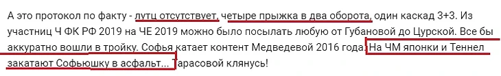После чемпионата Европы, где Алина Загитова упустила золотую медаль, которую ФФКР уже почти положила ей в карман, данный фанат Тутберидзе и АЗ_АТ разозлился так, что нашел у Софьи Самодуровой недокруты почти на каждом прыжкеd в произвольной программе: