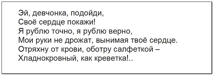 При просмотре короткой программы Теннел мне все время казалось, что у неё в руках не хватает топора, которым она зверски готова порубить всех своих соперниц. Ну, вот эта аллюзия плюс "механистичность катания" и подала идею альтернативке. Подобрал несколько подходящих по тексту песен, начал прикидывать. Думал сделать шуточную альтернативку так сказать в чистом виде, и тут случилось неожиданное...