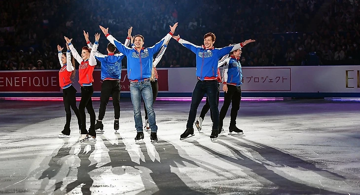 На прошлом чемпионате Боброва и Соловьев, укутав Жулина в платок, ожидали оценок в кокошниках, Медведева с Радионовой перетягивали «канат» против всей сборной, а Ковтуну посвятили сценку про его опоздание в аэропорт из-за аварии. Канадцы были в лосях, французы на велосипедах собственного «производства», а китаянки пытались выйти замуж. Обзор чемпионата в гифках из kiss&cry можно прочитать в блоге Golden Ice.