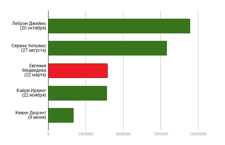 Медведева опередила чемпионов НБА Кайри Ирвинга (3,912 млн просмотров) и Кевина Дюрэнта (1,672 млн). Возможно, если учесть данные с других платформ, рейтинг изменится, но факт остаётся фактом – теперь у нас есть ещё один показатель популярности фигурного катания в мире.