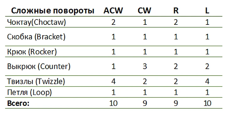 Обозначения: CW, ACW - вращение по часовой и против часовой, 180, 360, 720 - градусы оборотов, R, L - правая или левая нога. F, B - движения вперед лицом или назад спиной. O, I - внешнее или внутренне ребро.