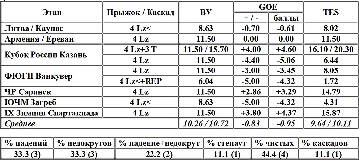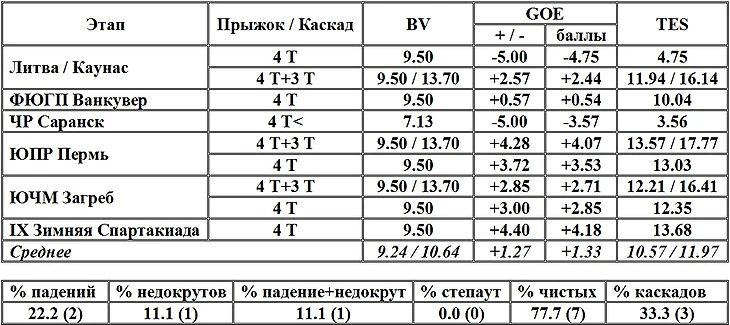 Из всех 18 четверных прыжков за этот сезон - 60% исполнено чисто, падений - чуть больше четверти (5 прыжков), каждый 5й прыжок исполняется в каскаде.