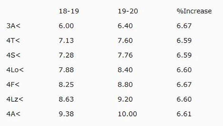 базовая стоимость недокрученных прыжков поднялась почти на 7%. И, что ещё важнее, штраф в GOE уменьшился с от -2 до -3 вплоть до от -1 до -2.