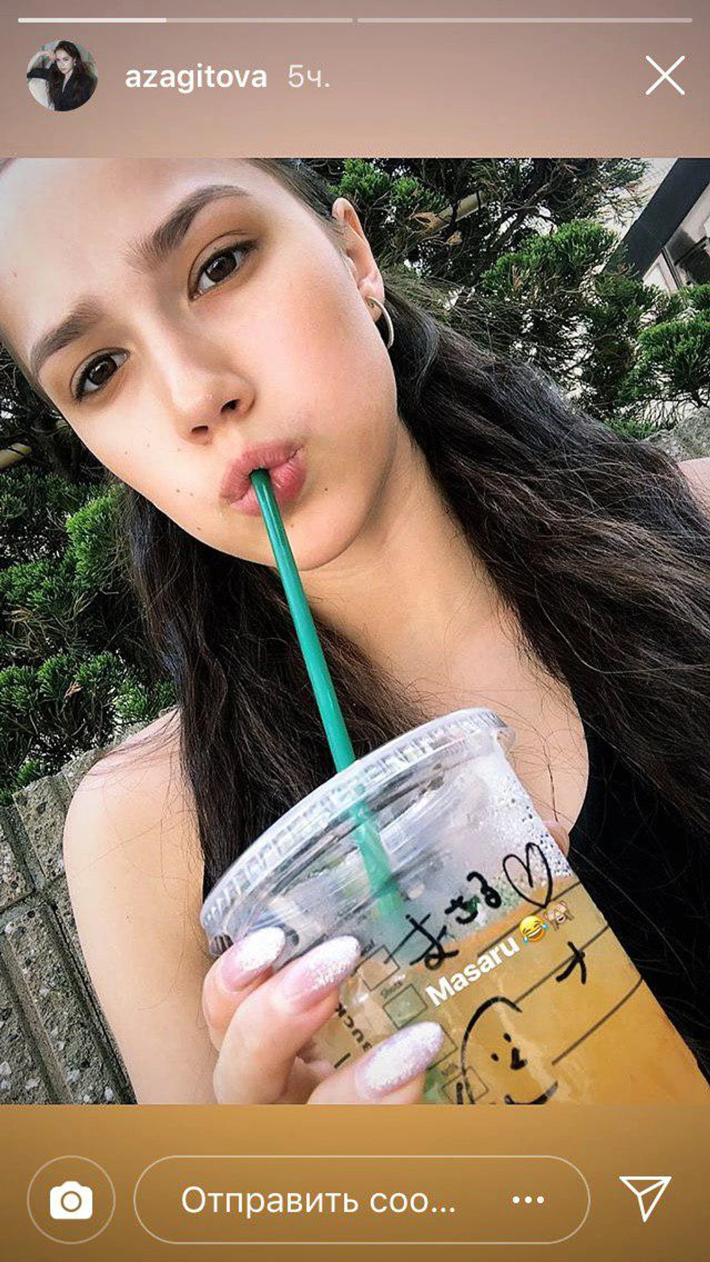 Масару не поехала с Алиной, но даже попивая фруктовые напитки, наша звездочка не забывает про нее. Присмотритесь к картинке на стакане: