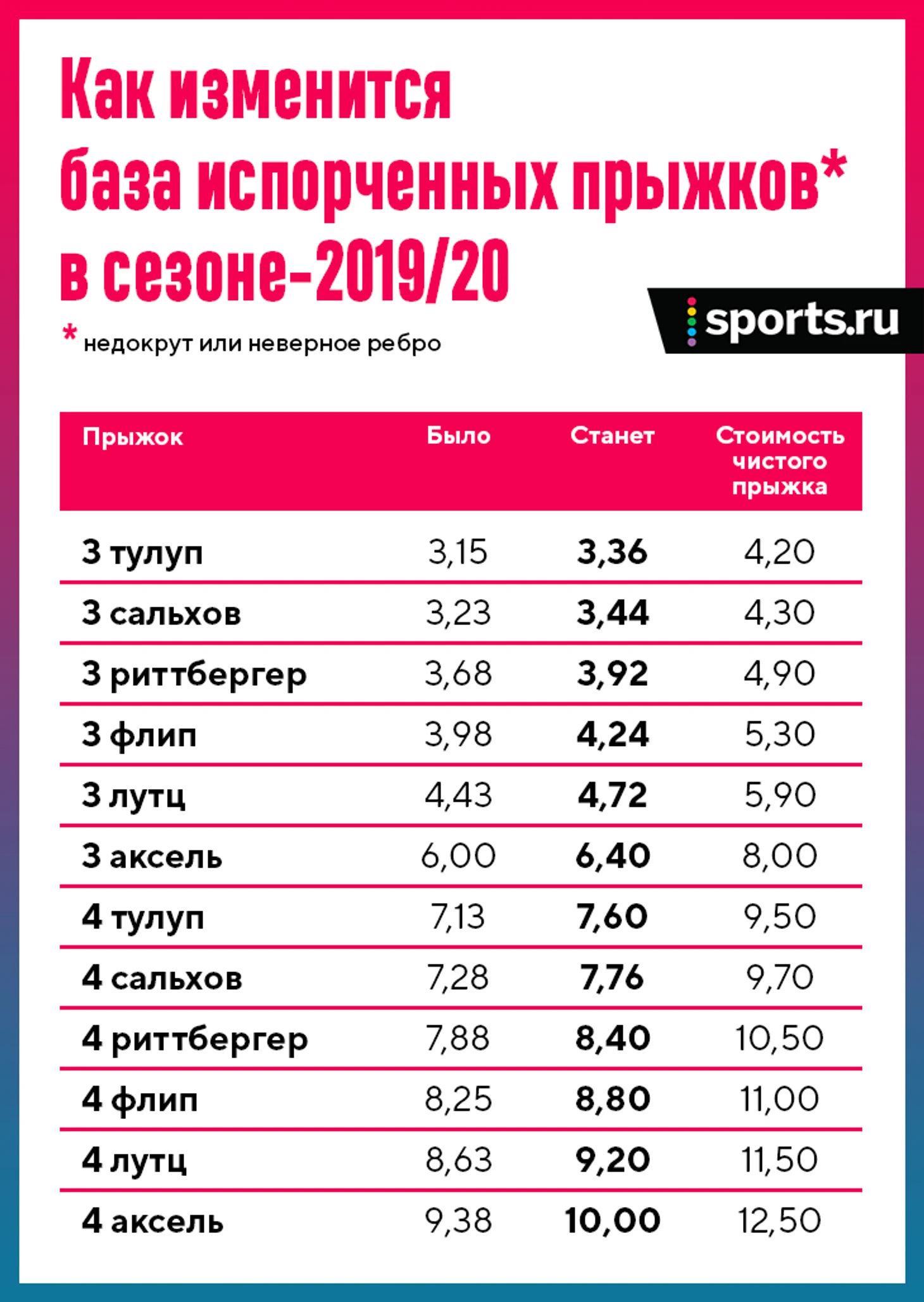• Увеличилась базовая стоимость недокрученных прыжков, а также флипа и лутца, исполненных с неверного ребра.