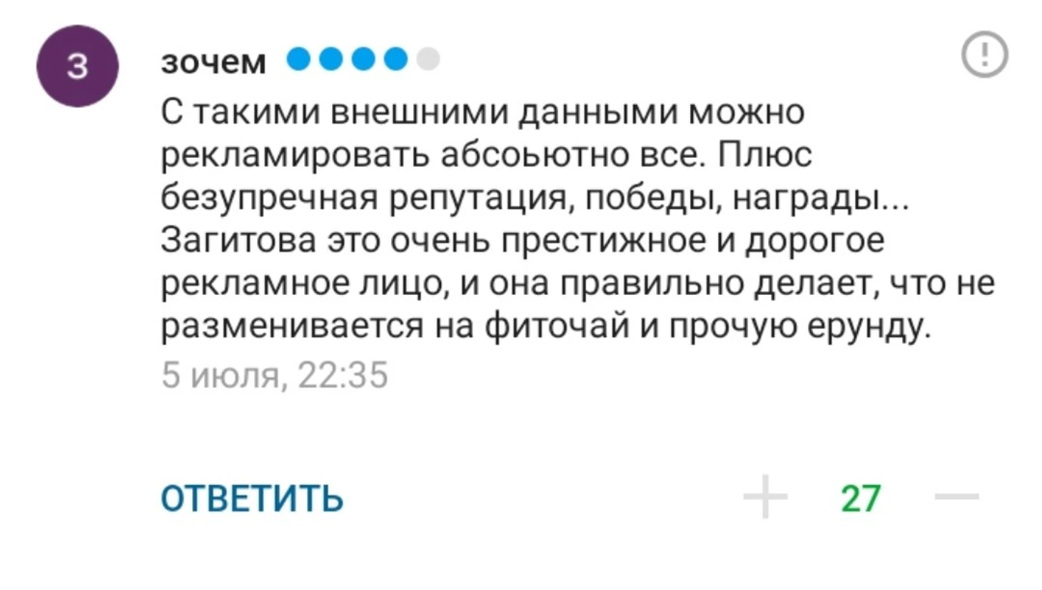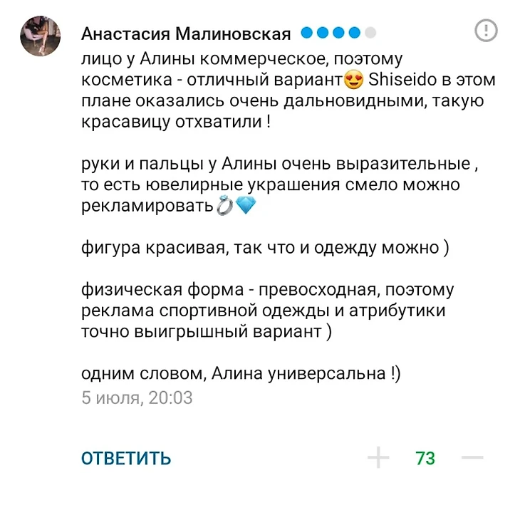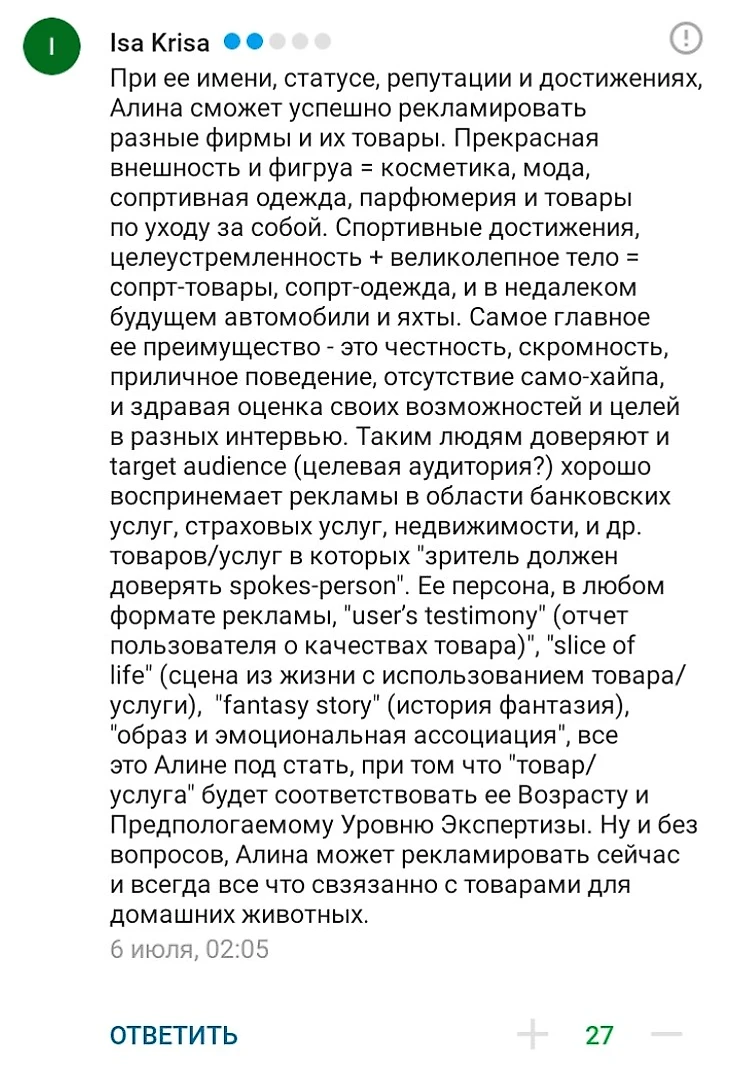 Кто-то подошел к вопросу серьезно и выдал анализ рекламного потенциала Алины.