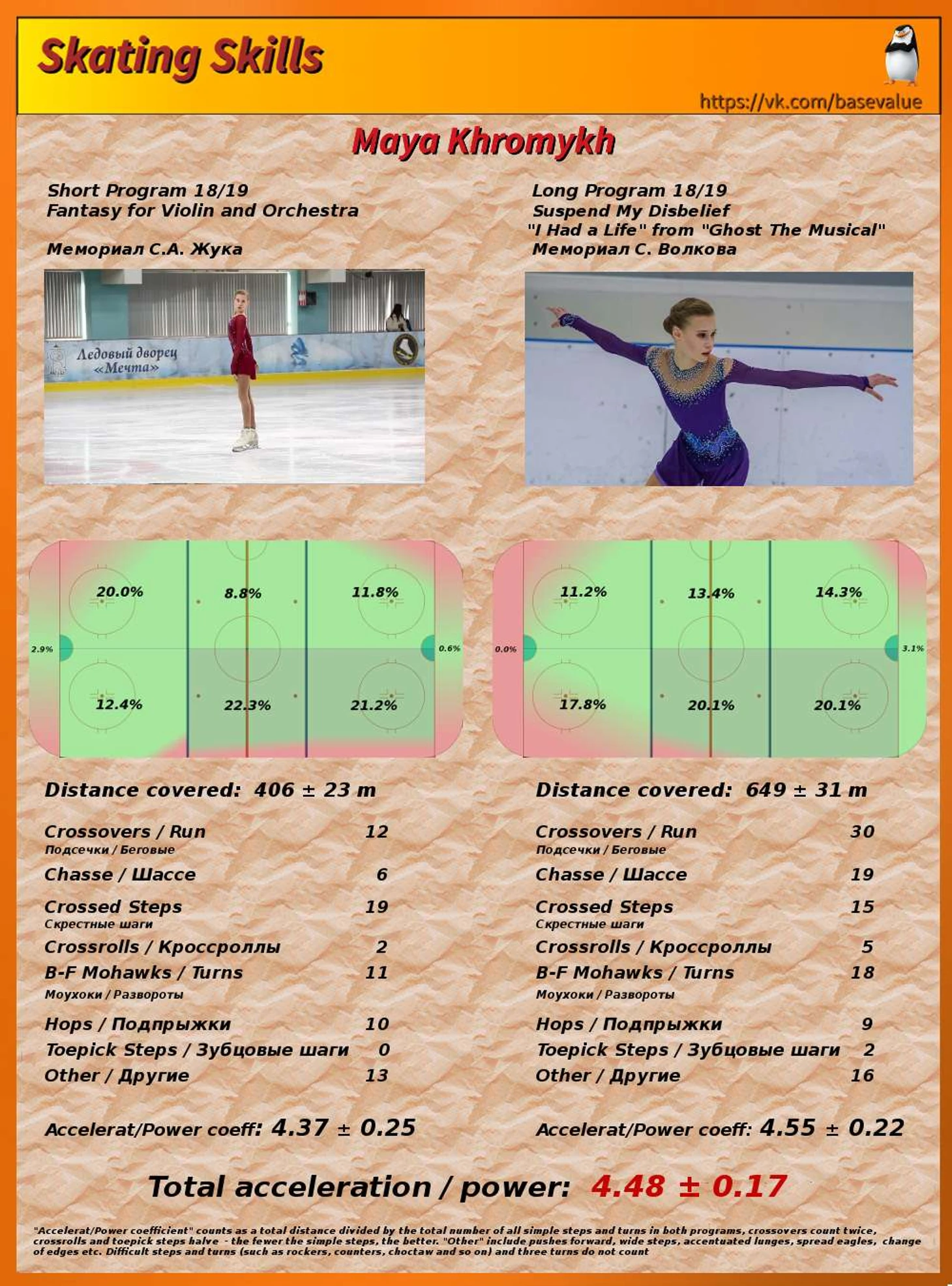 У Майи очень хорошее распределение езды по катку, пустых мест почти нет, есть небольшой перебор с беговыми в ПП, но для её возраста это не плохо, помните, что в следующем сезоне она только первый раз поедет по юниорам, уже там все может кардинально измениться. А может и нет.