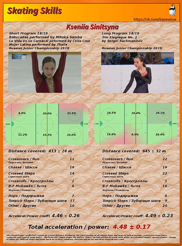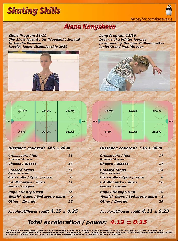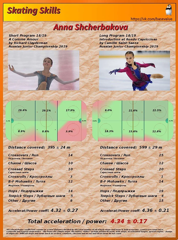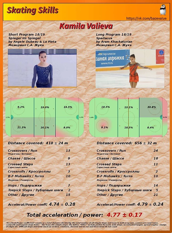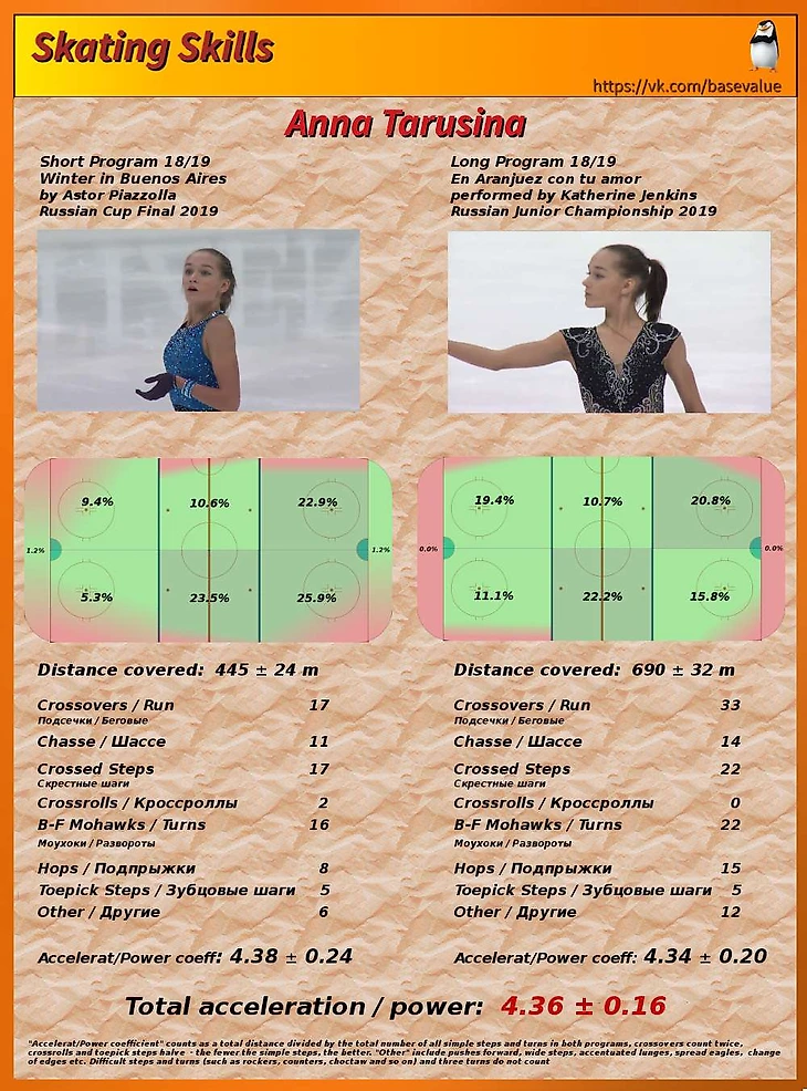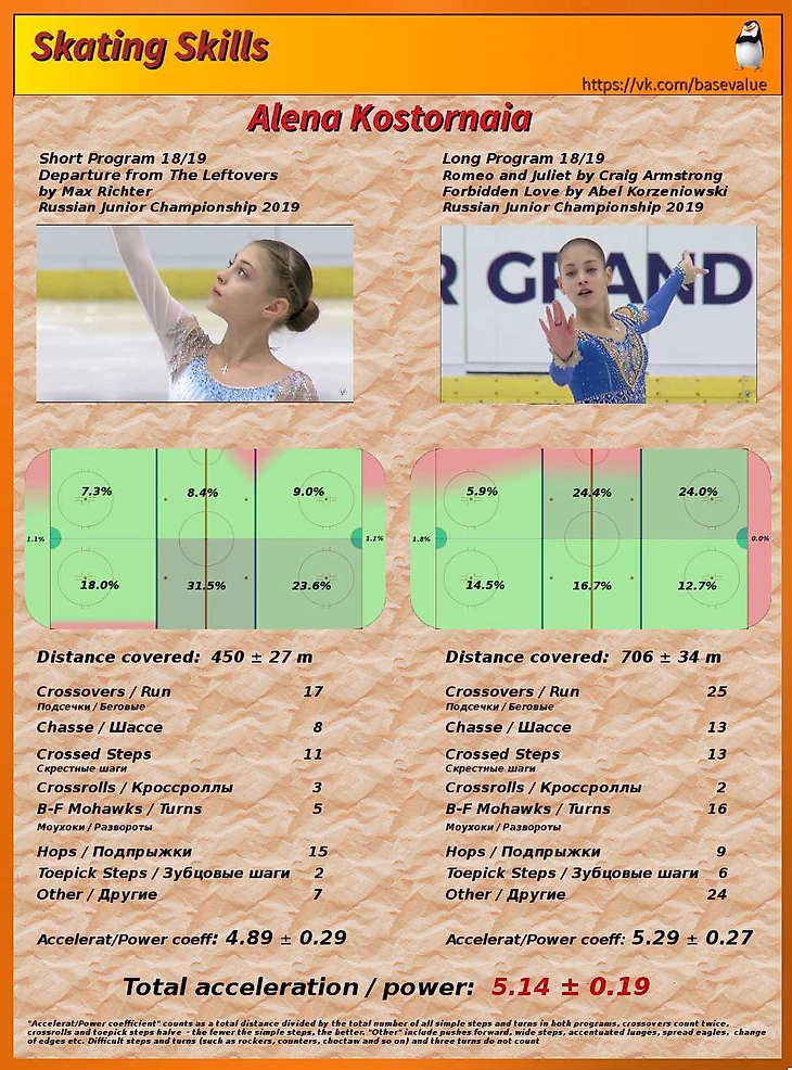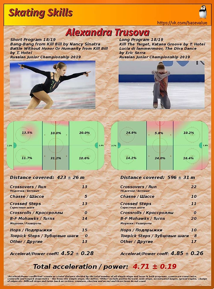 5) Самое важное: ни для кого не секрет, что у многих людей есть претензии к некоторым аспектам катания Трусовой. На всякий случай, еще раз отметим, что в этом посте мы не анализируем хореографию - в т.ч. дотянутость носочков, додержанность позиций, деревянность корпуса и т.п. Мы также не анализируем правильность исполнения отдельных шагов (правильность постановки стопы, ребер и т.п.) – исключение составляют только подпрыжки на сложных поворотах – если их явно видно и конек целиком отрывается ото льда, мы их засчитываем как 1 толчок. Как уже отмечалось, мы анализируем в первую очередь эффективность ускорения (или легкость раската - я не знаю как это емко назвать, но это, блин, не средняя скорость за программу и не максимальная), частично баланс (без правильного баланса хороший раскат невозможен), частично плавность (отсутствие мелких шагов/толчков). Ну и покрытие катка (хотя это, скорее, часть компонента CO, а не SS). У Трусовой перечисленные параметры высоки, по крайней мере, по юниорским меркам.