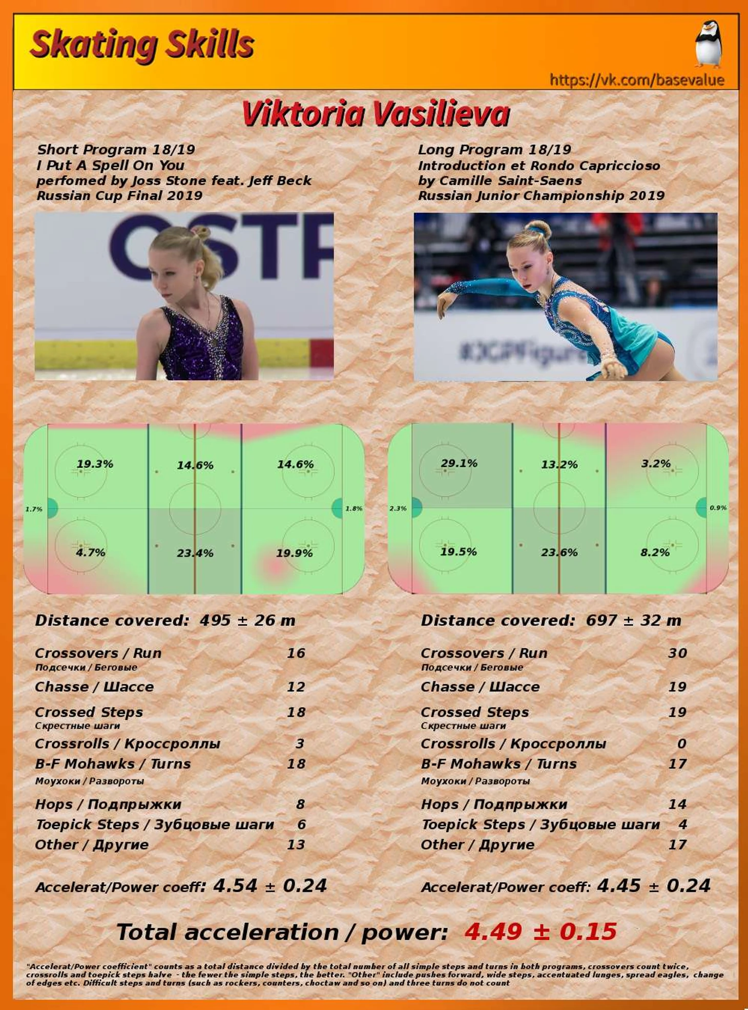 Васильева – местный шорт-трекист, дистанция просто убойная, за две программы фигуристка проезжает почти 1200 (!) метров, но, как и Тарусиной, ей это не очень помогает. Просто откатать на огромной скорости не работает, потому что наш хитрый рейтинг учитывает число шагов – здесь в знаменатель пошло 46 подсечек, а поэтому Вика оказалась лишь где-то в середине списка. Но конкурс по пройденному расстоянию она точно выиграла, по крайней мере, в КП и по сумме. Возможно, при просмотре вживую это бросается в глаза сильнее.