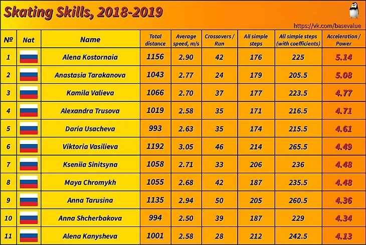 -набрать большой коэф. раската можно и двигаясь медленно - важно делать это без усилий. Именно поэтому мы стараемся учесть каждый шаг, даже если он кривой и у него нет наименования - ведь это и есть демонстрация усилий, которых быть не должно. Идея пришла из комментариев известных экспертов (ТАТ или еще кого-то) к каким-то выступлениям Костнер - ну известная фраза, что, мол, "она покрывает всю площадку в два толчка" или что-то в таком роде. Переводя эту мысль в математику, это некая величина прямо пропорциональная дистанции (в данном случае "вся площадка") и обратно пропорциональная количеству простых шагов (в данном случае "два толчка"). Это не значит, что она покрывает эту площадку быстро или медленно. Это только значит, что ей не требуется много усилий, она может долго скользить и сила трения её не тормозит. Заметьте, из этого не следует будто рейтинг подогнан под Костнер. Мы даже не пытались искать видео её прокатов с фанкама и что-то прикидывать. Вполне может оказаться, что по этой схеме у неё раскат хуже, чем у Косторной и Таракановой. Важно ухватиться за правильную идеологию.