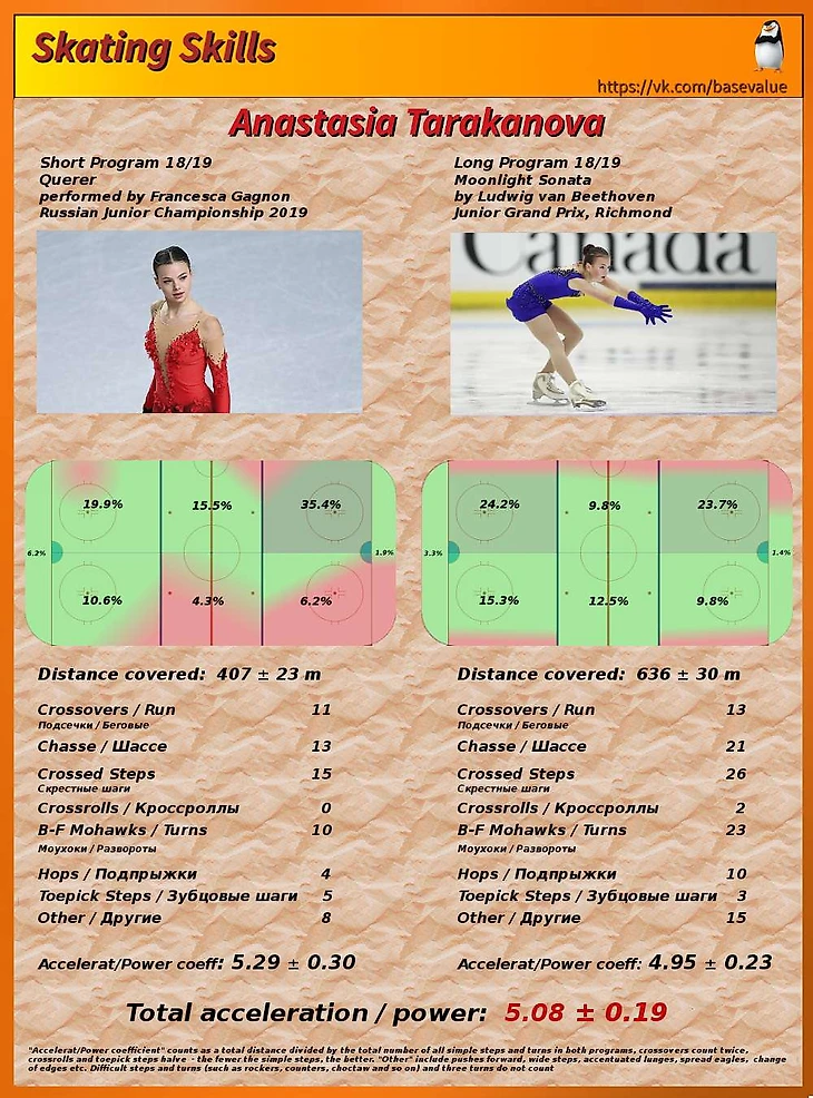 У Таракановой аномально низкое количество беговых и подсечек - 24 на две (!) программы, я прямо сейчас не уверен, что вообще у кого-нибудь в мире их меньше, включая парней. Почему такая сравнительно небольшая дистанция? Одна из возможных причин (помимо узкого канадского катка) - длительность программ. КП занимает лишь 161 секунду, произвольная длится 215, в сумме даже меньше, чем у Усачевой. Возможно, это связано с тем, что Тараканова занималась в недешевой академии Евгения Плющенко, возможно, что там посекундная оплата хореографа и постановищка, а спонсора у Насти до сих пор нет. Вы понимаете. Также можно сказать, что был некоторый дисбаланс с покрытием катка, по крайней мере, в КП. Видно, что Тараканова, как и Щербакова с Синицыной, предпочитала кататься на расстоянии от судей. Что до раската, мы пока не можем точно сказать, за счет чего образовалась разница в коэффициенте между КП и ПП, но общее число, вполне возможно, что несколько занижено.