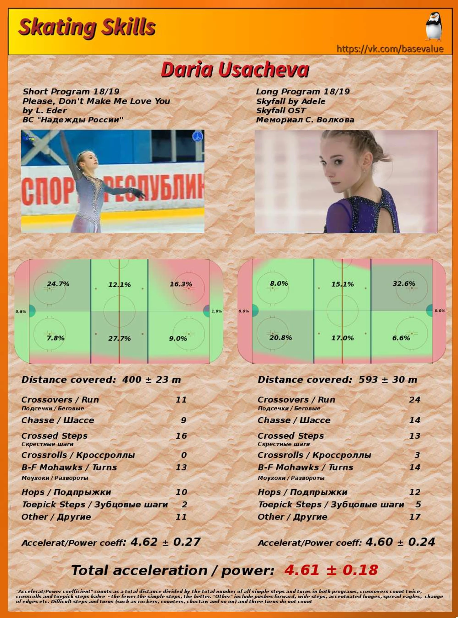 Прокаты Усачевой здесь тоже подобраны неудобно - короткая практически с конца сезона, произвольная практически с начала. Но расхождение вышло маленьким. Дарья, в отличие от большинства соперниц, предпочитает не торопиться, катает вдумчиво и тщательно делает шаги. Дистанция за две программы у неё самая маленькая из всех, но и толчков тоже не особо много, поэтому индекс вышел лучше, чем у предыдущих участниц. Также у Усачевой практически самые короткие по времени программы - 166 секунд в КП и 212 в ПП. Это отчасти оправдывает небольшой пробег. Кто следующий?
