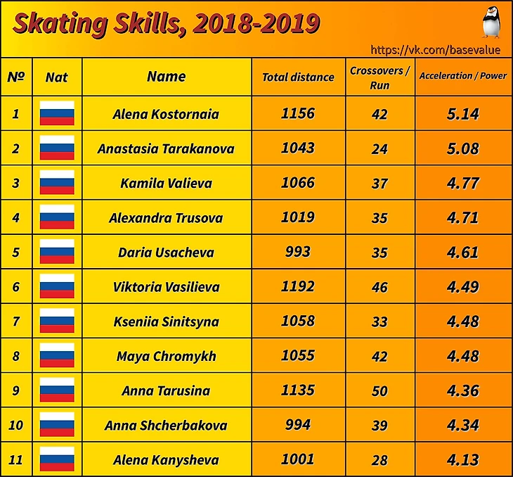 Меня не удивляют показатели Трусовой. Странно, вы как будто оправдываетесь. )) Я так и предполагал, что она уступает только этой тройке - Косторная, Тараканова, Валиева. Многие отмечают быстрое катание Трусовой. В показалке "Unstoppable" у неё особенно хорошо заметна скорость, её драйвовое, энергичное катание. Про сложность программ и говорить нечего - самые сложные с точки зрения совмещения сложных прыжков, переходов и покрытия катка. Над качеством шагов и плавности скольжения есть куда работать.