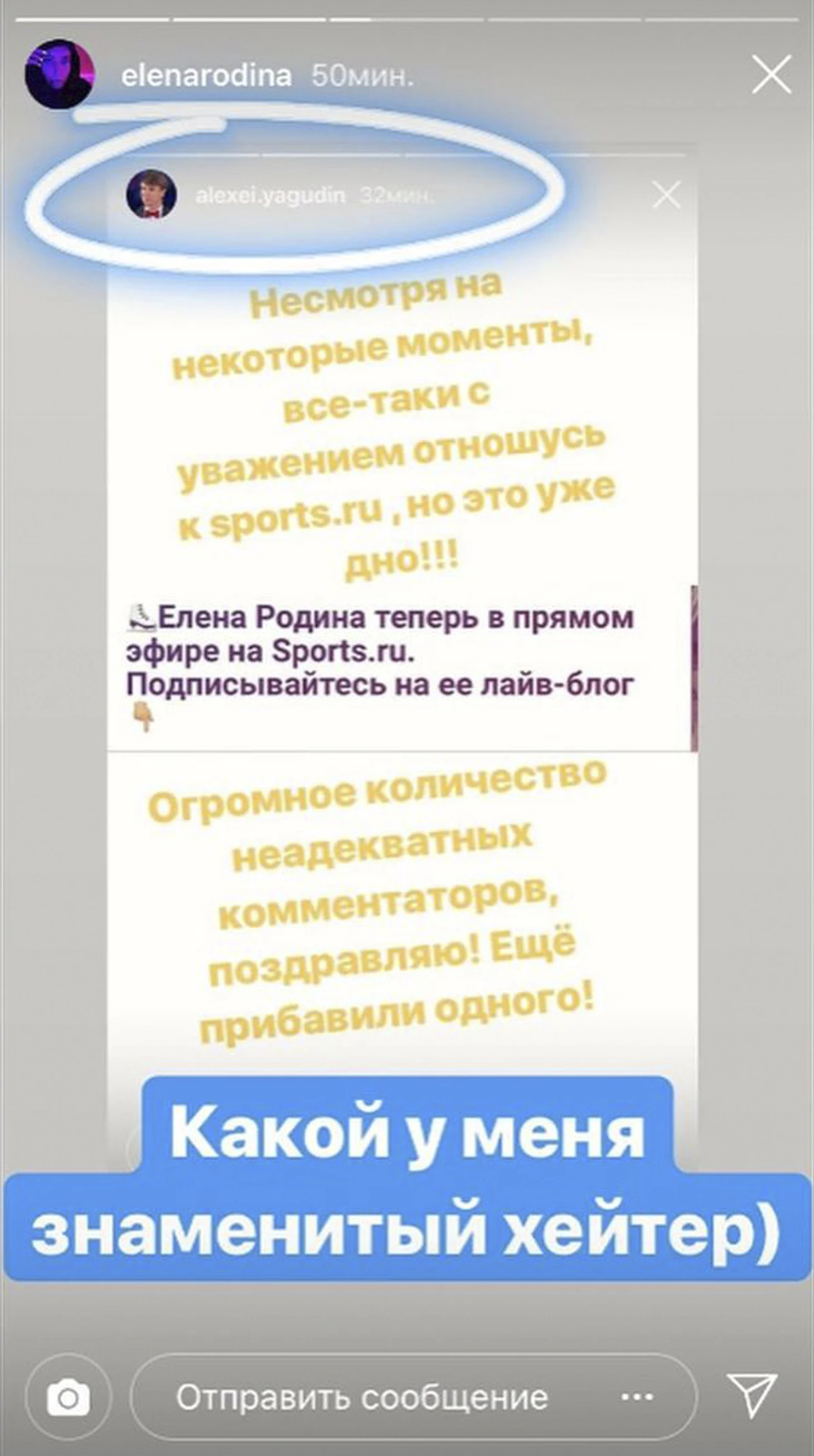 Больше всего нас поразила её реакция на пост Ягудина, полная сарказма и пренебрежения к человеку, который так много сделал для развития фигурного катания в России и мире (см. приложенное изображение). А ведь это уже не первый случай, когда Е. Родина позволяет себе подобные высказывания в адрес Олимпийских чемпионов, называя их разного рода оскорбительными именами. Первый случай был гораздо хуже — тогда она словесно набросилась на несовершеннолетнюю Алину Загитову.