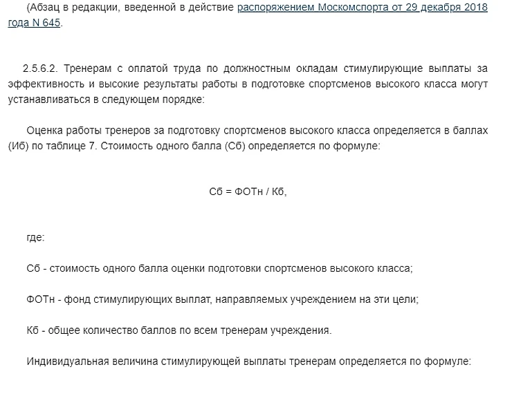 Документ "Об утверждении Примерных отраслевых рекомендаций по введению новой системы оплаты труда работников государственных учреждений, подведомственных Департаменту спорта города Москвы (с изменениями на 29 декабря 2018 года)". И так только то что имеет отношение к делу. Пункт "2.5.6. Выплаты за эффективность и высокие результаты работы." И в нем вот это: