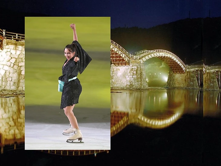 Это деревянный мост, являющийся одним из трёх самых известных мостов в Японии. Его 5-арочное строение прекрасно. Строительство моста было закончено в 1673 году Киккава Ёсихиро удела Ивакуни. Однако мост был уничтожен тайфунов и потом в 1950 году и восстановлен в 1953 году. Длина моста составляет 193,3 метра (210 метров, учитывая поверхность моста). Ширина - 5 метров, а высота - 6,64 метра. Зеленый гид Мишлен присудил ему две звезды.