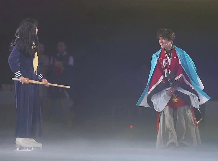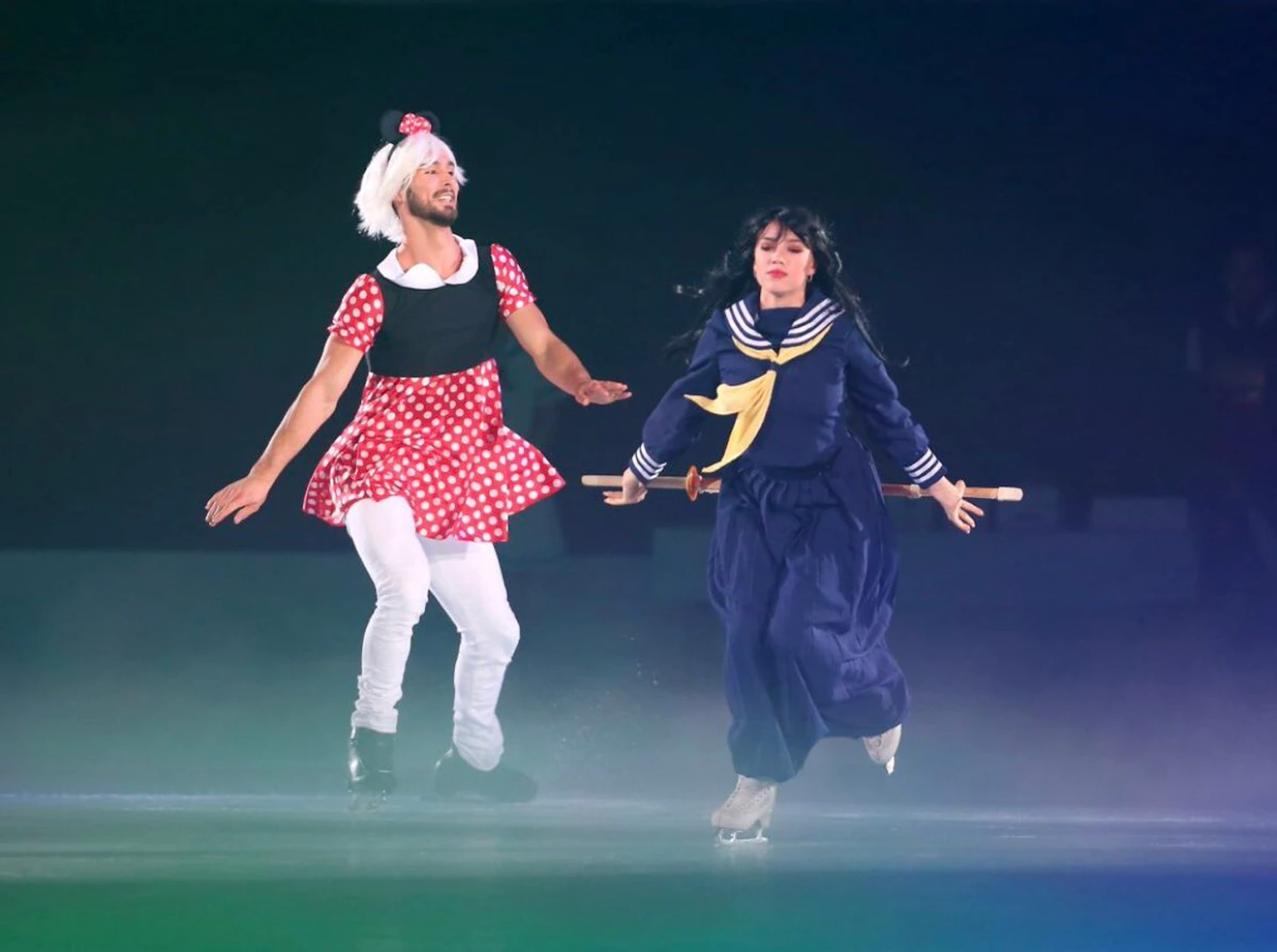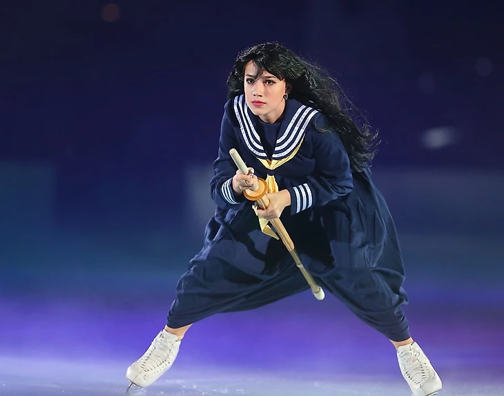 Девушка на задании: поколотить палкой всех французких фигуристов-мужчин на шоу.