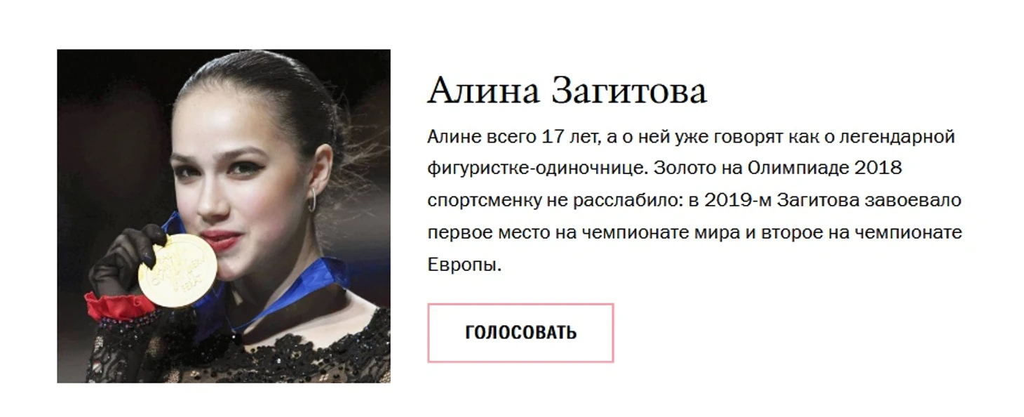 Напоминаю, что Алина Загитова номинирована на премию "ЖЕНЩИНА ГОДА " в категории СПОРТСМЕНКА ГОДА по версии журнала Гламур. Ссылка для голосования: