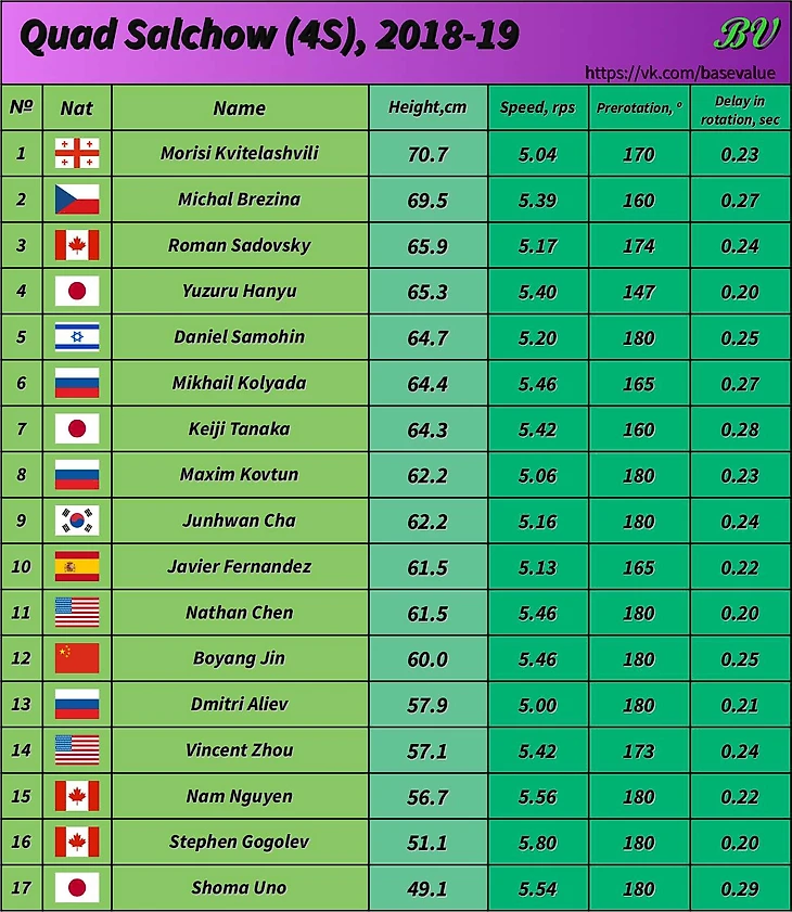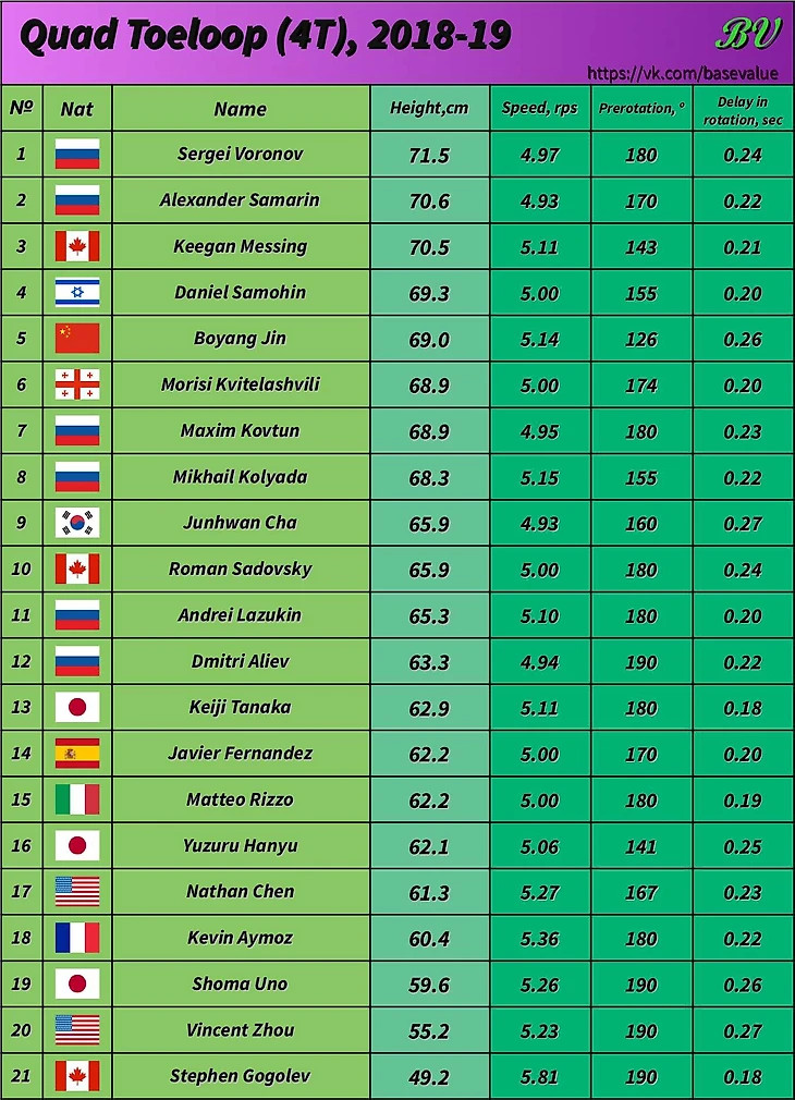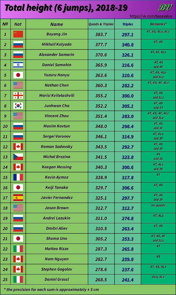 Напомним методику: итоговый рейтинг высоты - это сумма шести прыжков, где часть тройных заменяется на соответствующие квады, если фигурист их показал в сезоне 2018-19. Таким образом, набрать большую сумму можно двумя способами - 1) прыгать много разных квадов; 2) прыгать как можно выше тройные.