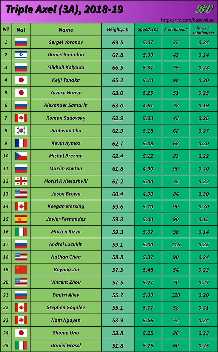 Самый популярный прыжок в мужском ФК. Если среди женщин его пока регулярно исполняют две фигуристки, то среди парней примерно первая сотня мирового рейтинга владеет 3А, а в этом выпуске абсолютно все, поэтому все участники есть в первой табличке. Вот так она выглядит: