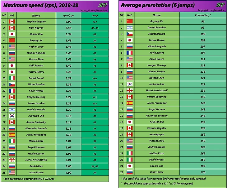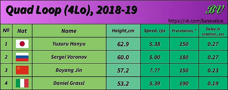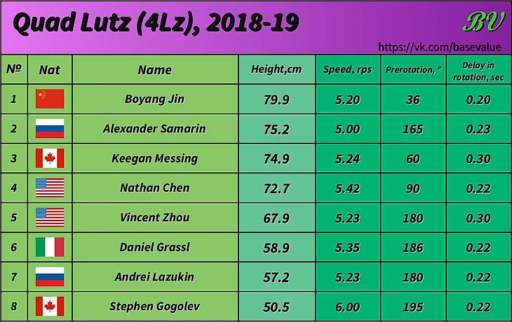 У итальянского вундеркинда эффекты оптимизации техники выражены гораздо сильнее. Воронов здесь присутствует чисто формально, его самые успешные ритты недокручены лишь чуть меньше, чем на полоборота. Наконец, Боян Цзинь попал в этот топ случайно, оказалось, что он прыгнул риттбергер на национальном Гран При в начале прошлого сезона, причем, в тот раз приземлил успешно, так что здесь все честно. Единственное, качество видео совершенно не позволяет адекватно оценить скорость вращения на этом прыжке, поэтому она в таблице не указана.