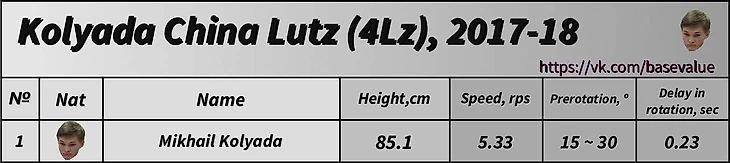 Ну и, конечно, все кто внимательно следят за новостями из мира высоты прыжков понимают, что в этом рейтинге отсутствует некто Михаил Коляда из России, у которого отдельные попытки 4Lz выходили сильно за 80 сантиметров. Например, знаменитый лутц с китайского этапа 2017 года тем же методом выходит около 85 см.