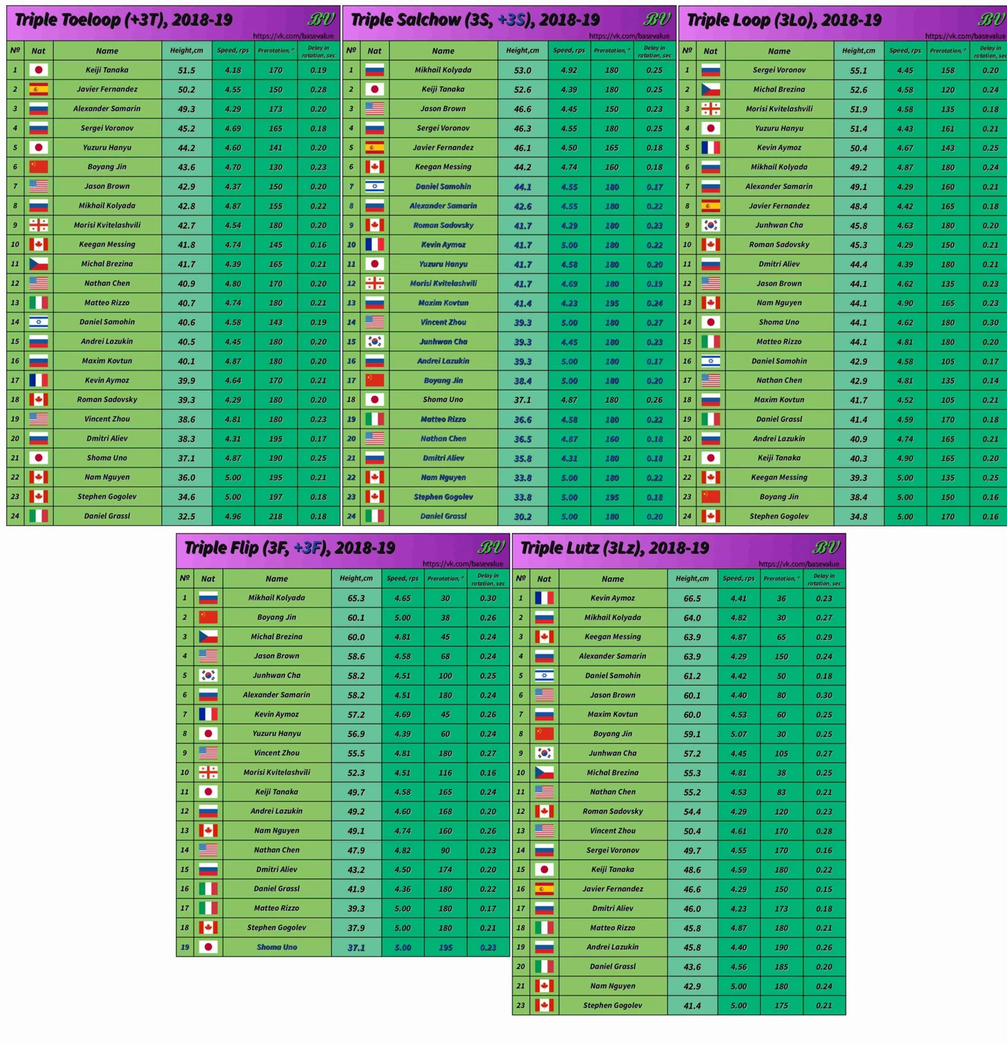По отдельности см. здесь - 3Т, 3S, 3Lo, 3F, 3Lz. Списки не полные, так как не все фигуристы вставляли все прыжки.