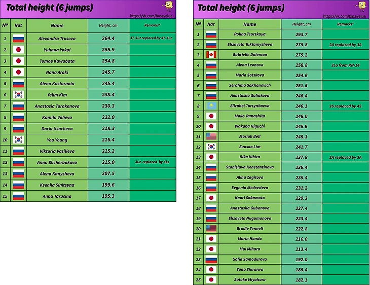 Напомним результаты рейтинга суммарной высоты юниорок (26 выпуск) и взрослых одиночниц (27 выпуск) по шести прыжкам (аксель, тулуп, сальхов, риттбергер, флип и лутц):