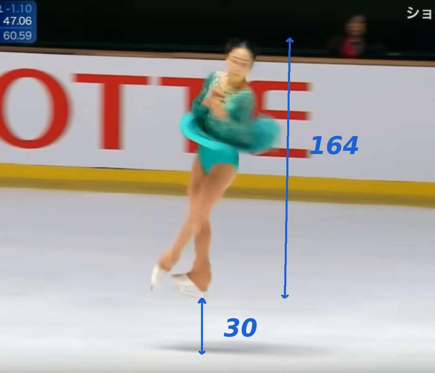 Также можно вспомнить 4Lz Юзуру Ханю с Ростелекома 2017, покадровый метод дает для него 72 см, perform-live насчитал 69 (у IceScope наверное вышло бы больше :)). Стоит отметить, что геометрический способ до некоторой степени более выгоден фигуристам с большим углом наклона в воздухе - покадровый метод этот угол не учитывает. Этим отчасти можно объяснить тот факт, что для Ханю у нас часто получаются меньшие значения, чем у Fuji, в отличие от большинства остальных. Но я не уверен в этом, может есть и другие объяснения.