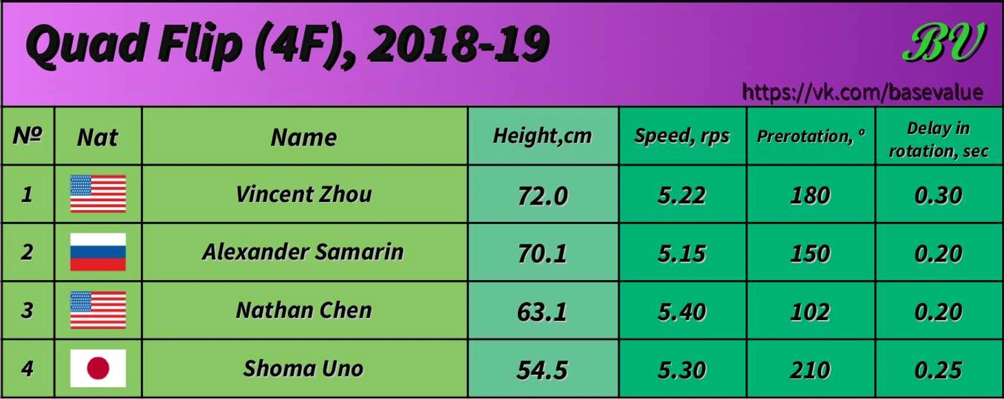 Этот квад такой же редкий, как и предыдущий. Тот факт, что его не используют так активно как лутц, возможно связан с неправильным ребром отрыва у многих парней, масса фигуристов игнорирует также и тройной флип - естественно, не потому, что не могут его скрутить. В сезоне 18/19 лишь четыре одиночника приземлили флип на соревнованиях и вот она таблица: