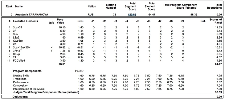 Анастасия Тараканова выступила с произвольной программой в рамках второго этапа юниорского Гран-при в США (Лейк-Плэсид). За свой прокат Анастасия получила от судей 120.86 балла.
