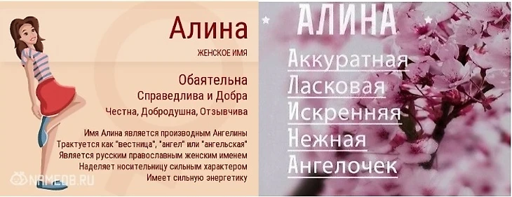 Имя Алина также распространено в Скандинавии, где считается формой имени Аделина (такой вот элегантный мостик от одной олимпийской чемпионки к другой), означающего «благородная», «великодушная», «величественная». В славянских странах оно ассоциируется со словом «алый» и художественными образами «Алых парусов» и «Аленького цветочка», то есть с ожиданием счастья и надеждой. В Шотландии имени Алина дают толкование «честная» и используют как парное к мужскому имени Алистер. В Греции – «солнечный луч», а в восточных странах (от араб. Ali) – возвышенная, высокая.