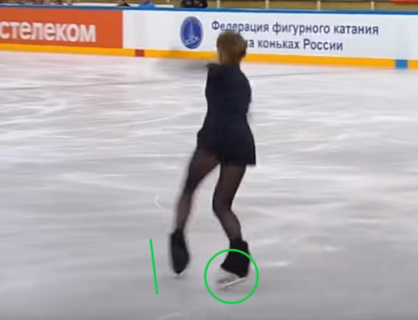 Также обратите внимание, что на лутце и флипе фигуристка при толчке на правом коньке почти не задействует ребро, прыжки остаются в значительной степени, как и полагается канонами, зубцовыми. Предварительное вращение составляет всего четверть оборота, в то время как ряд других одногруппниц (Щербакова, Трусова, Загитова) воруют половину оборота и более, прыгая лицом вперёд.