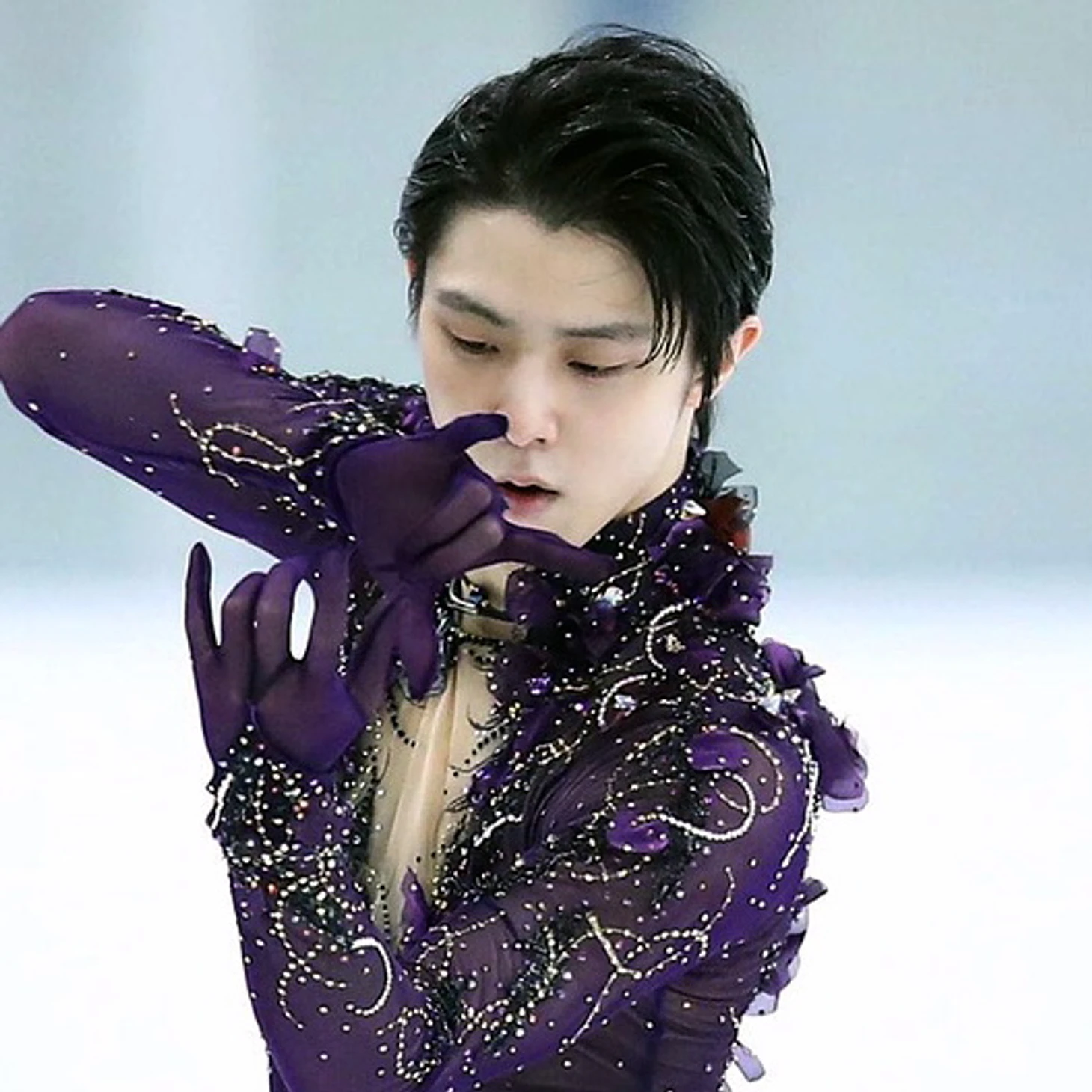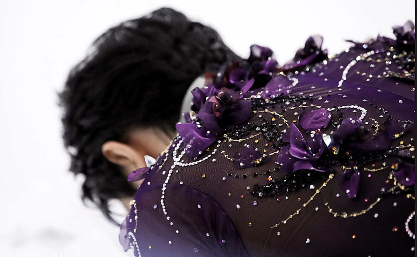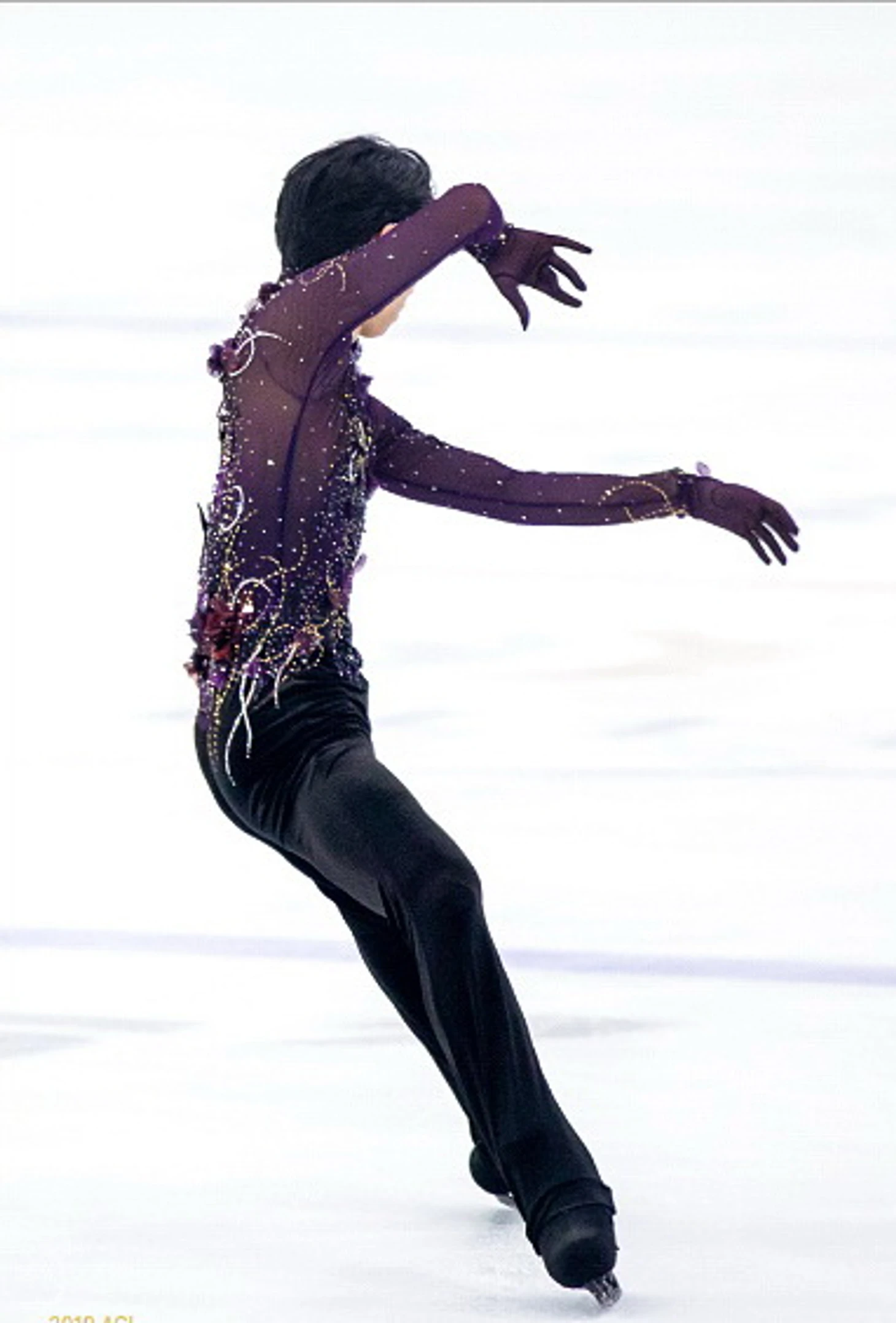 Новый костюм к этой программе вызвал неоднозначную реакцию у некоторой части зрителей, но на мой взгляд он помогает Ханю достичь максимального совершенства в передаче образа программы!Глубокий фиолетовый оттенок подчеркивает мифическую составляющую, а затейливый рисунок страз и бабочки напоминает золотой век элитного модерна.
