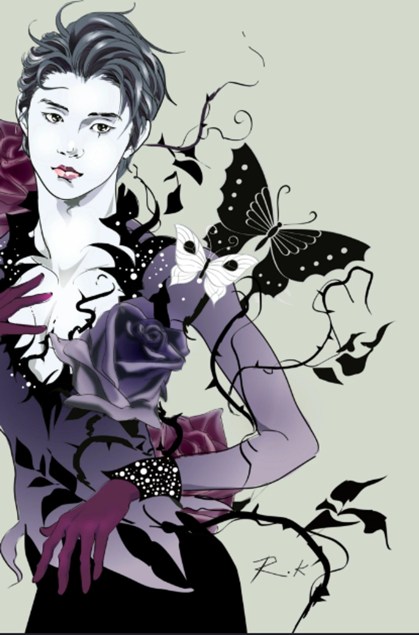 Фиолетовый (紫 – мурасаки, можно ещё перевести как «колокольчик») – цвет благородства и силы. Темно фиолетовый – это старшая благодать, светло-фиолетовый – младшая благодать. Кстати, в Японии единственными цветами, которыми можно было одарить самурая, являются нежные ирисы. А ещё «ирис» и «боевой дух» обозначаются одними и теми же иероглифами ( 闘志). Про розы уже много и подробно написала Маргарита.
