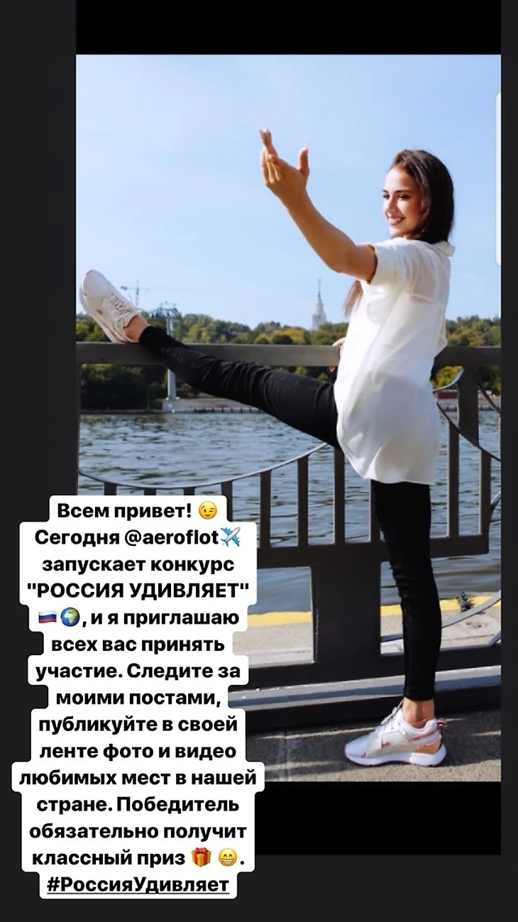 "Всем привет 😊 ☀️ Вы знаете, что я часто летаю, и у меня для вас приятная новость! Ceгодня @aeroflot✈️ запускает конкурс "РОССИЯ УДИВЛЯЕТ"🇷🇺🌍, и я приглашаю всех вас принять в нём участие. Опубликуйте фотографию, по которой путешественники, которые ни разу не были в России, ни за что не догадались бы, что на фотографии Россия, а узнав, что это Россия, приятно удивились бы 😯 🤩. Давайте покажем всему миру, какая красивая страна Россия💟 и как много в ней удивительного! Я, например, решила опубликовать свою недавнюю фотографию потрясающего места в Москве. Делитесь и вы своими фотографиями 📸 и обязательно ставьте хэштеги #аэрофлот#россияудивляет. Победитель обязательно получит классный приз в виде авиабилетов".