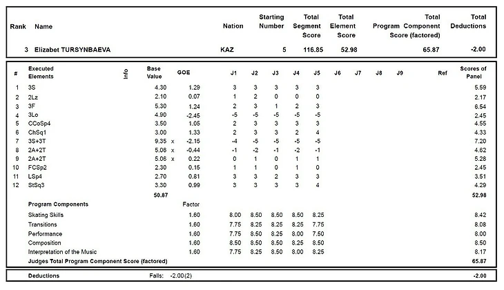 Однако, по ходу проката Элиза исполнила первый каскад с падением на 3 тулупе, потеряв 2 тулуп и ГОЕ, а в двух других каскадах с 2 акселем прыгнула только 2 тулуп.