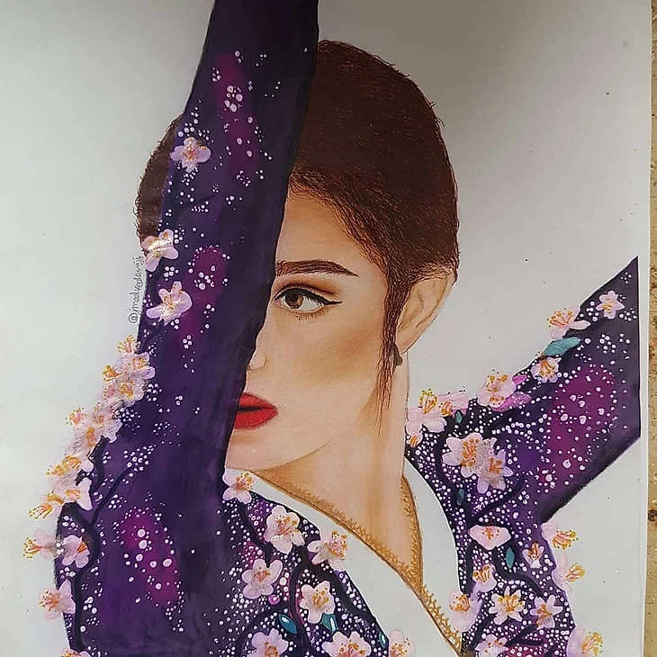 Замечательный костюм темно-фиолетового цвета, украшенный цветами сакуры, подчёркивает особый благородный статус молодой японской девушки, выбравшей путь гейши, путь человека искусства.
