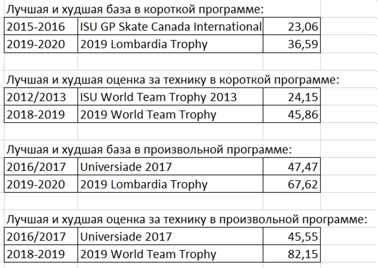Так что я обложилась протоколами. По-взрослому обложилась. Честно подняла все доступные записи. Так, например, по Лизе Туктамышевой я подняла архив аж с 2010 года, с ее юниорских времен. Разложила по цифрам 57 стартов, на которых она принимала участие с финала юниорского гран-при 2010 г. Все протоколы, которые нашла (не все, к сожалению, удалось раскопать, но большая часть все ж таки сохранилась в архивах).