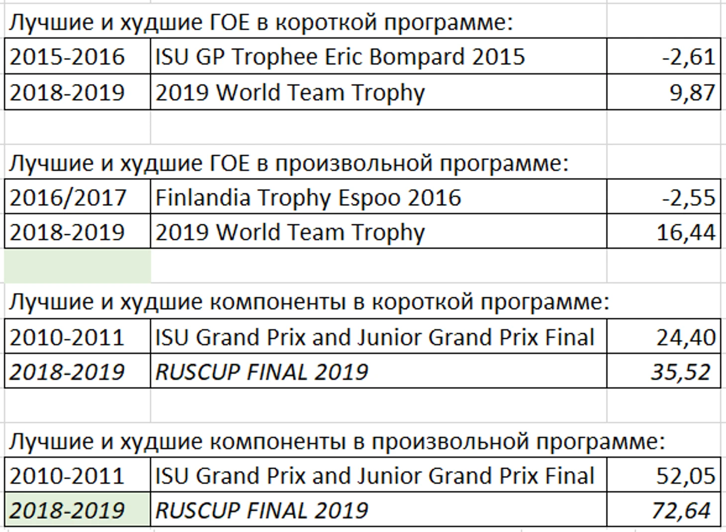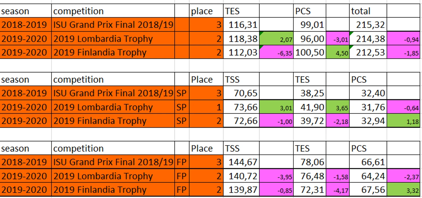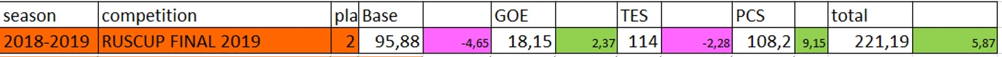 Прокат "оранжевый", т. е. и в короткой, и в произвольной программе были минусовые ГОЕ. База упала на 4,65 балла по сравнению с последним стартом (Финал Гран-при2018). Зато компоненты выросли на 9 баллов.