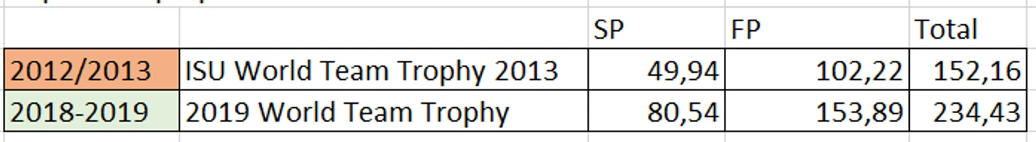 Вот таблицы с цифрами последних четырех прокатов Лизы. Цифры рядом с каждой оценкой показывают, насколько она возросла или упала в сравнении с предыдущим международным стартом (именно международным, потому что цифры на внутренних стартах вообще никак не коррелируют с тем, что было до них):