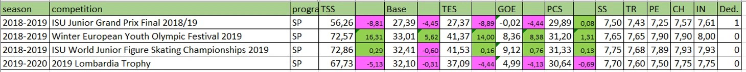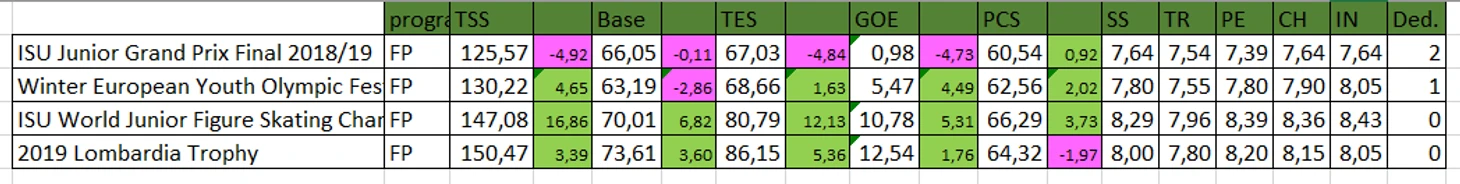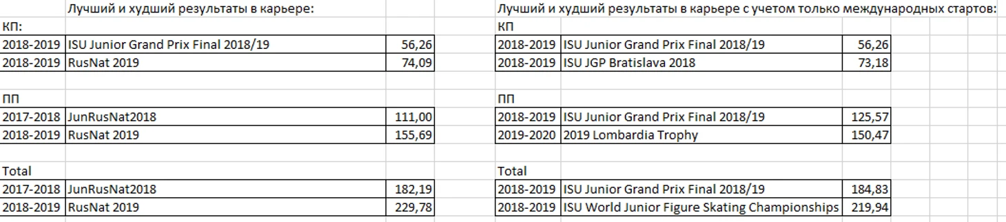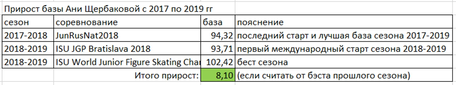 Обратите внимание, что Анин юниорский бэст я беру от юниорского первенства России 2018 года. На самом деле, в том сезоне у нее были еще старты, и более успешные. Но на большинстве внутренних стартов оценки вызывают у меня оторопь и огромное изумление. Так что я решила взять отборочный для мира старт, это хоть какая-то основа. А не финал кубка России, на котором Аня тоже участвовала в сезоне 17/18.